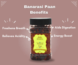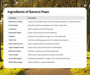 Experience the iconic taste of Banaras with our Premium Banarasi Paan Meetha mouth freshener! Crafted with a blend of natural ingredients, this traditional after-meal treat cleanses the palate, aids in digestion, and delights with a balance of sweet, spicy, and tangy flavors. A delightful cultural experience, this freshener is perfect for gifting or enjoying on your own.
