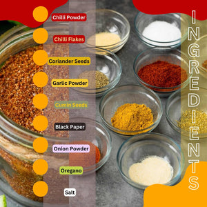1. Handpicked Ingredients: We've curated a blend of 100% natural ingredients to create the perfect balance of flavors. This includes a delightful combination of chili powder, chili flakes, onion powder, coriander powder, oregano, garlic powder, cumin seeds, black pepper, and salt. Each ingredient is thoughtfully chosen to contribute to the rich tapestry of taste that is synonymous with Mexican cuisine.