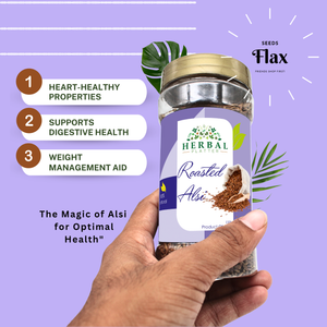 Introducing Herbal Platter Roasted Flax Seeds (Alsi) - a nutritious powerhouse offering multiple health benefits. These salted roasted flax seeds come in a convenient 150g jar, making them the ideal choice for a healthy snack. With their high fiber content and Omega-3 fatty acids, they promote heart health and aid in weight loss.