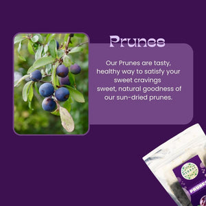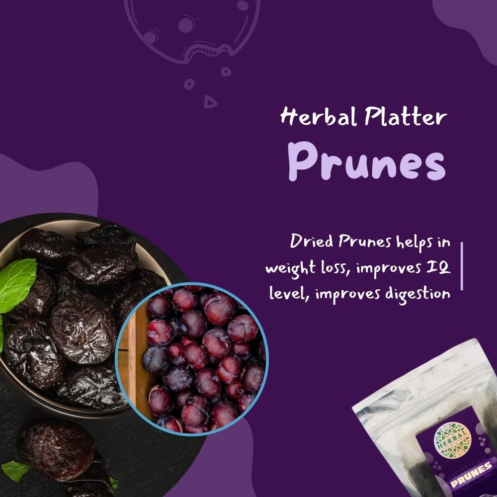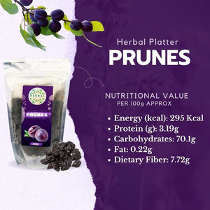 Herbal Platter Dried Prunes Bursting with natural sweetness and packed with health benefits, our dried prunes are a delightful addition to your daily diet. Carefully selected and meticulously dried to preserve their rich flavor and nutritional goodness, these prunes are a perfect snack for any time of the day. Our Dried Prunes are sourced from the finest quality fruits, ensuring that each prune is plump, juicy, and bursting with flavor. They are naturally dried to perfection, without any added sugars or preservatives, making them a wholesome and guilt-free treat. Whether you enjoy them straight from the bag, mixed into your morning oatmeal, or incorporated into your favorite recipes, our Dried Prunes are sure to satisfy your cravings while nourishing your body. Indulge in the rich, velvety texture and sweet taste of our Dried Prunes, knowing that you're fueling your body with essential nutrients. Prunes are renowned for their high fiber content, which promotes digestive health and helps regulate your digestive system. Additionally, they are packed with antioxidants, vitamins, and minerals, making them a nutritious choice for maintaining overall wellness. With Herbal Platter Dried Prunes, you can enjoy the goodness of nature in every bite. Whether you're looking for a convenient snack to fuel your busy day or a wholesome ingredient to elevate your culinary creations, our Dried Prunes are the perfect choice. Treat yourself to the irresistible flavor and health benefits of Herbal Platter's Dried Prunes today and experience the difference that quality and care can make in every bite. Treat your taste buds to a journey of bold and exquisite flavors with Herbal Platter Prunes. Indulge in the sweet, natural goodness of our sun-dried prunes. Packed with fiber and antioxidants, they make for the perfect guilt-free snack. Our prunes are a tasty, healthy way to satisfy your sweet cravings. Herbal Platter brings you the best of nature's bounty in every bite.