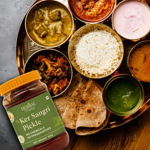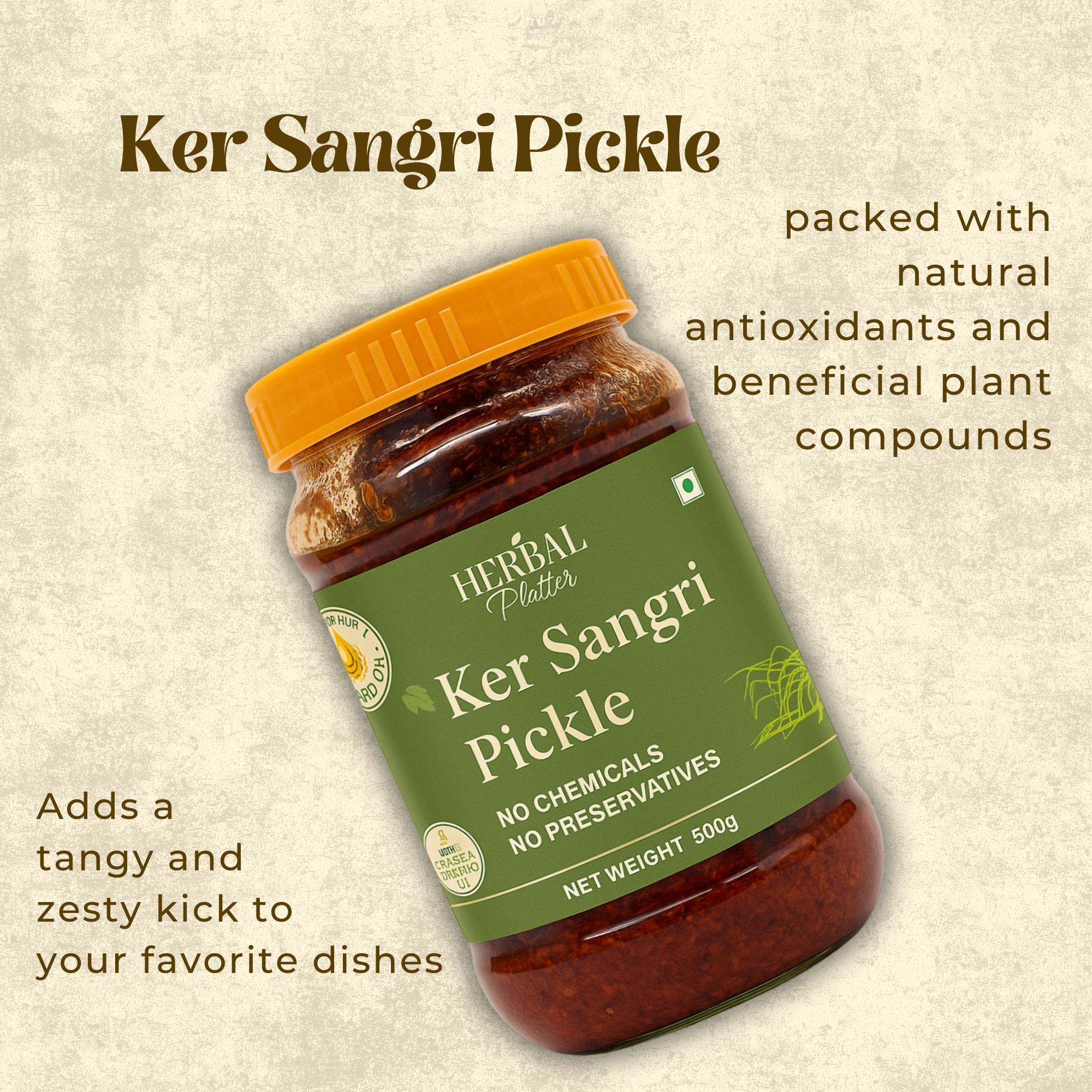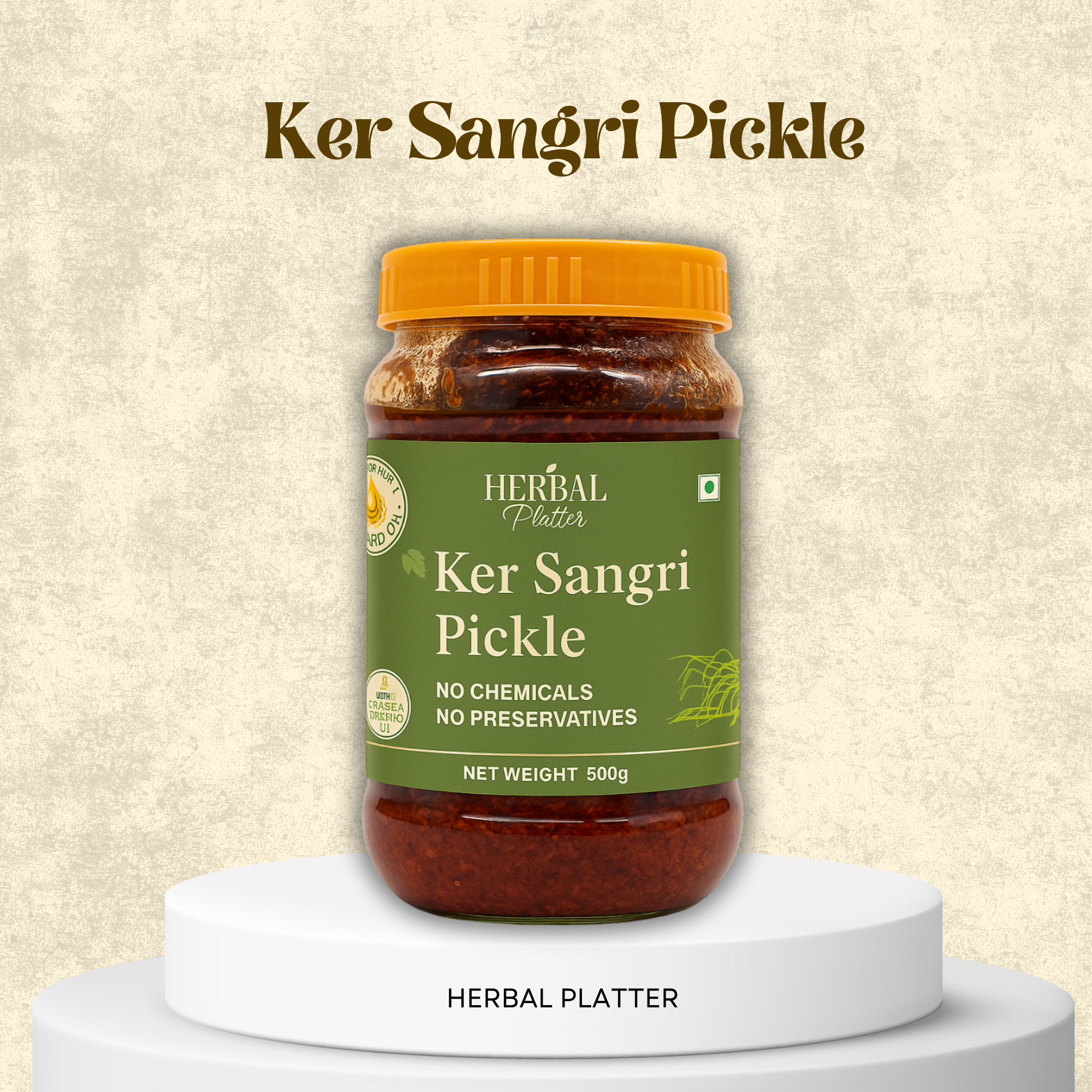 Herbal Platter’s Ker Sangri Pickle is made using handpicked Ker berries and Sangri beans from the desert villages of Jaisalmer & Barmer — sun-dried traditionally, and blended with authentic Rajasthani spices, cold-pressed mustard oil, and Himalayan rock salt. This is not just a pickle… it’s a heritage recipe cherished for generations.