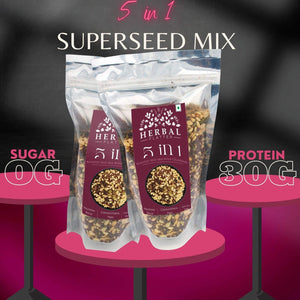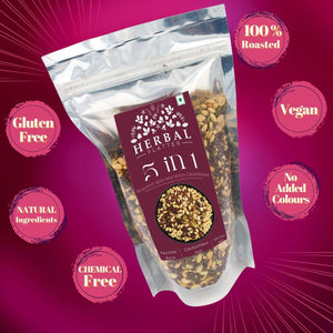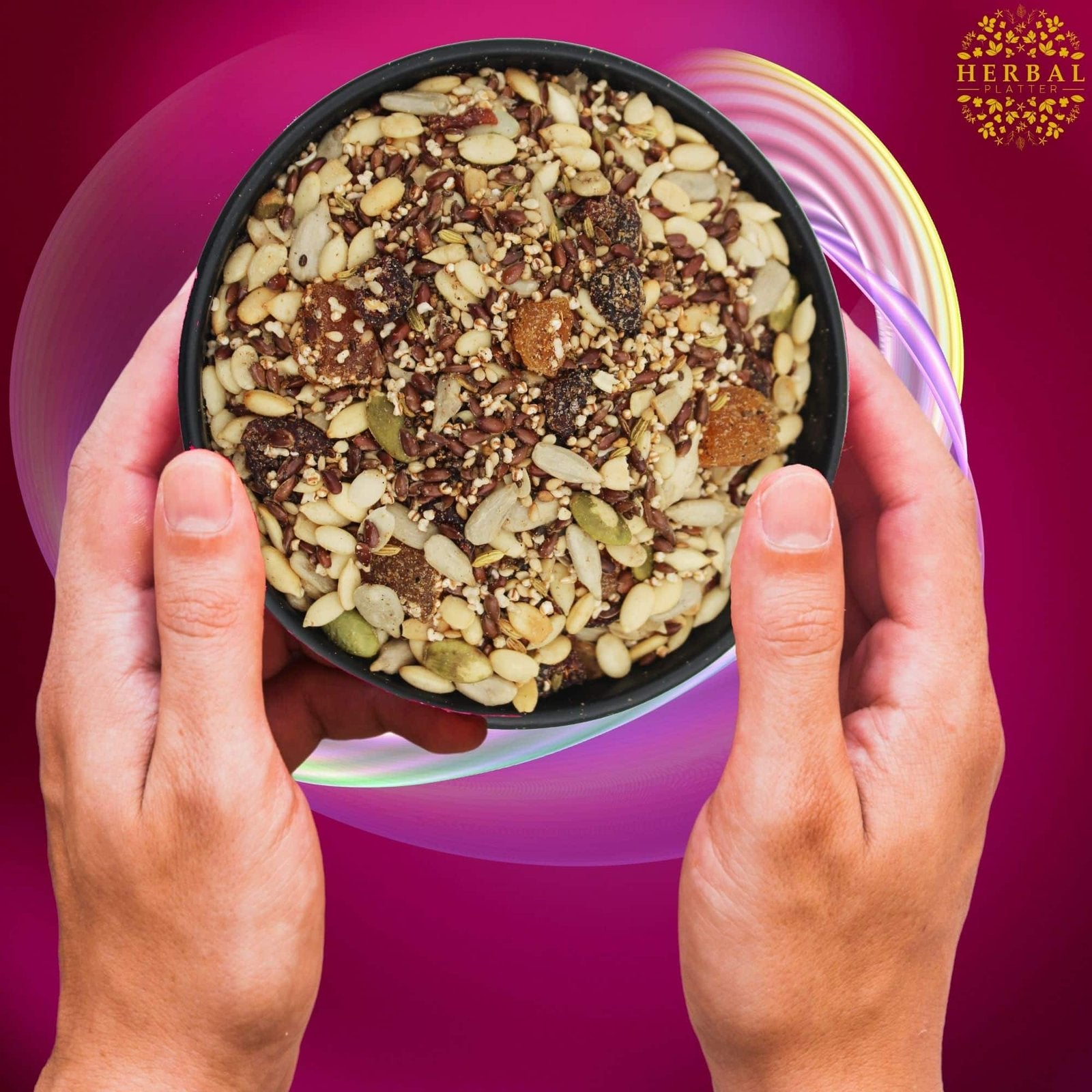 Introducing Herbal Platter 5 in 1 Super Seed Mix with Cranberries, the ultimate healthy snack in a convenient 250g zipper pouch. This power-packed blend combines watermelon seeds, pumpkin seeds, sesame seeds, flax seeds, and a hint of fennel and cumin for a delicious and nutritious snacking experience. Our Super Seeds Mix is a nutritional powerhouse, carefully curated to provide you with a diverse range of health benefits. Each seed variety brings its unique qualities to the mix, ensuring you get a well-rounded dose of essential nutrients. Watermelon seeds offer protein, healthy fats, and magnesium for strong muscles and bones. Pumpkin seeds contribute antioxidants, iron, and zinc to support immune function and promote radiant skin. Sesame seeds are packed with calcium, iron, and fibre, while flax seeds provide a rich source of omega-3 fatty acids for heart health. To add a touch of aromatic goodness, we've included fennel and cumin seeds, which not only enhance the flavor but also aid digestion and reduce bloating. We take pride in sourcing the finest quality ingredients for our Super Seeds Mix. Each seed is carefully roasted to perfection, ensuring a satisfying crunch and preserving their natural goodness. The convenient zipper pouch packaging keeps the mix fresh and allows for easy snacking wherever you go. Indulge guilt-free in Herbal Platter 5 in 1 Super Seeds Mix with Cranberries. This wholesome snack is perfect for a quick energy boost during the day or as a nutritious option for your outdoor adventures. The addition of tangy cranberries adds a burst of sweetness and antioxidants to the mix, making it even more enjoyable. Elevate your snacking experience with Herbal Platter 5 in 1 Super Seeds Mix with Cranberries. It's a delicious and convenient way to fuel your body with the power of seeds. Discover the incredible health benefits and addictive flavors that this carefully crafted blend offers. Treat yourself to a snack that not only satisfies your cravings but also nourishes your body. Grab your 250g zipper pouch and embark on a journey of wholesome snacking with Herbal Platter.