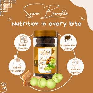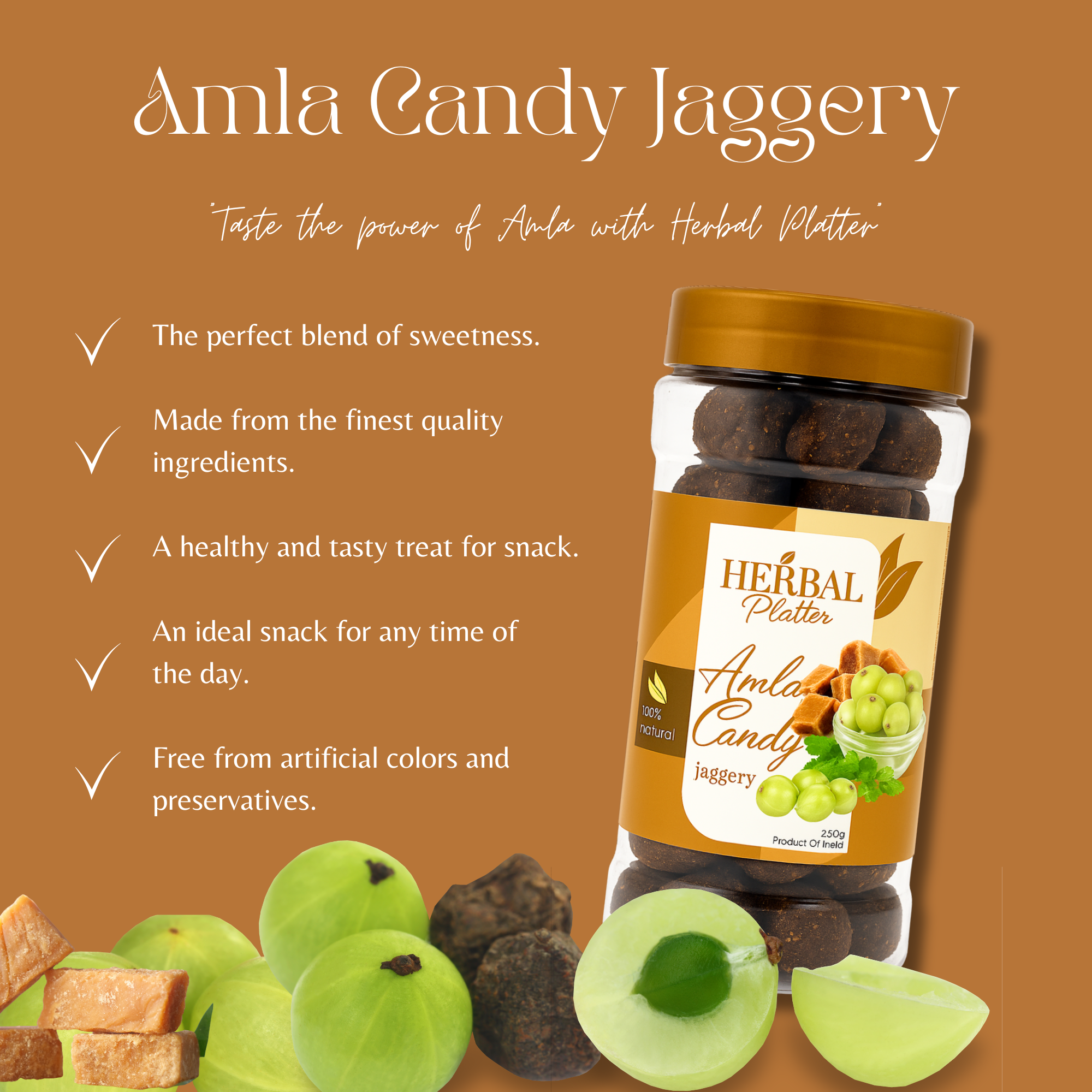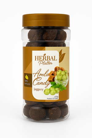 Herbal Platter’s Amla Candy Jaggery is a wholesome, naturally sweet treat made from sun-dried amla coated with pure jaggery. Every bite blends the earthy richness of jaggery with the tangy goodness of amla, creating a flavour that is comforting, nostalgic, and deliciously healthy. Amla is a natural powerhouse of Vitamin C and antioxidants, while jaggery provides minerals, energy, and digestive support. Together, they make a perfect guilt-free snack for kids and adults — sweet enough to satisfy cravings, and healthy enough for daily consumption.Soft, chewy, and authentically traditional, this candy is ideal for post-meal snacking, travel, school tiffins, or simply whenever you want something tasty yet natural.