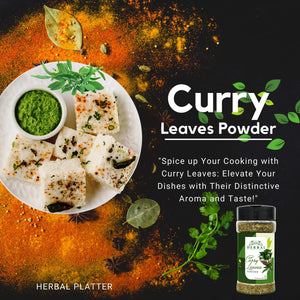 Herbal Platter Curry Leaves - Enhance Your Culinary Creations These aromatic leaves are a staple in many cuisines around the world and are renowned for their distinctive taste and health benefits. Why Choose Herbal Platter Curry Leaves? At Herbal Platter, we take pride in delivering top-quality culinary ingredients to passionate cooks and chefs. Our Curry-Leaves are sourced with care, dried to perfection, and packaged to preserve their goodness. When you choose Herbal Platter Curry Leaves, you're choosing: