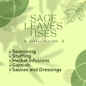Herbal Platter Sage Leaves. Handpicked from the finest sources and delicately dried to preserve their natural essence, our sage leaves promise a journey of culinary excellence and holistic wellness. Whether infusing your dishes with their savory flavor or harnessing their therapeutic properties in herbal teas and remedies, our Sage Leaves redefine the essence of purity and versatility. Experience the sublime blend of tradition and innovation with Herbal Platter, where every leaf carries the promise of nourishment and vitality.