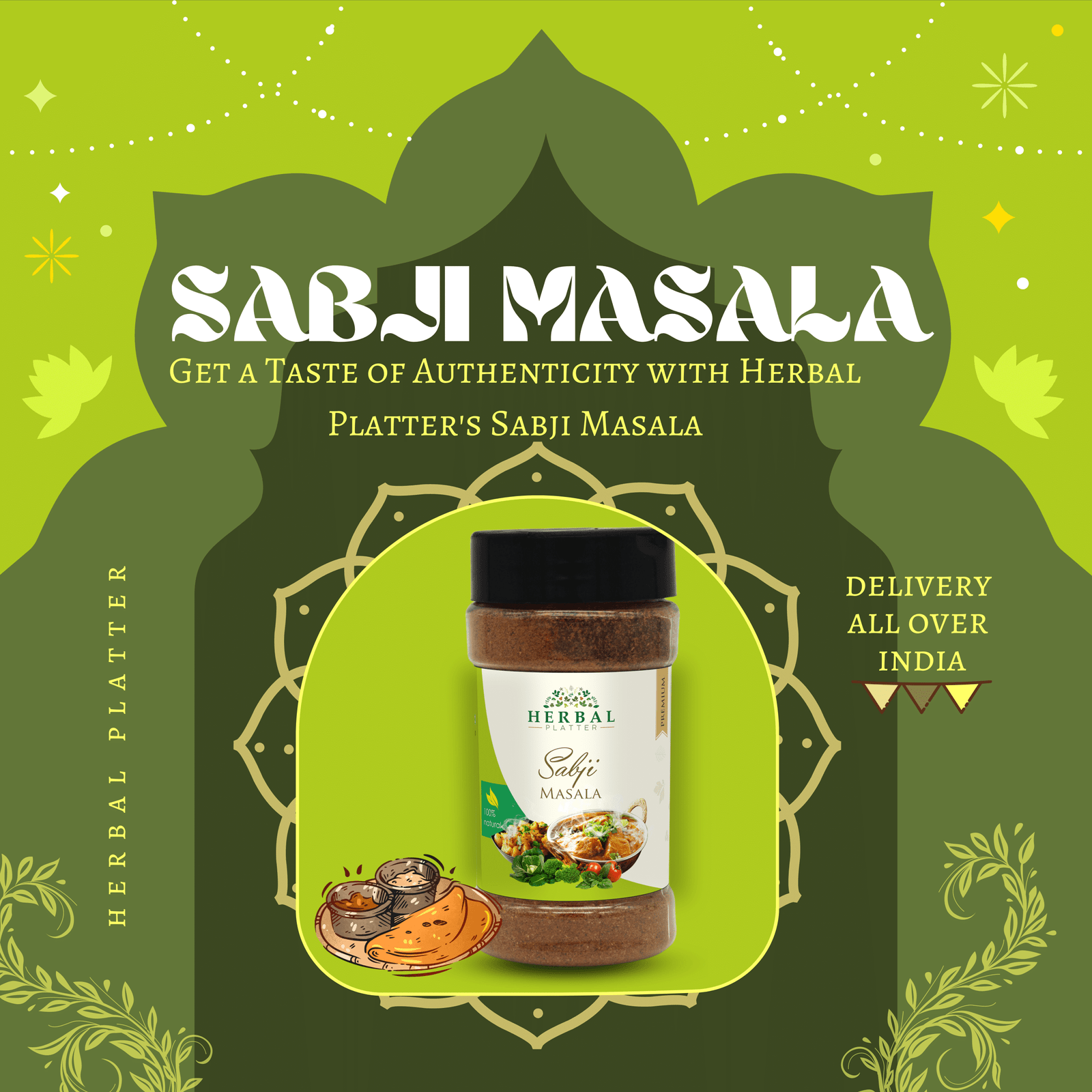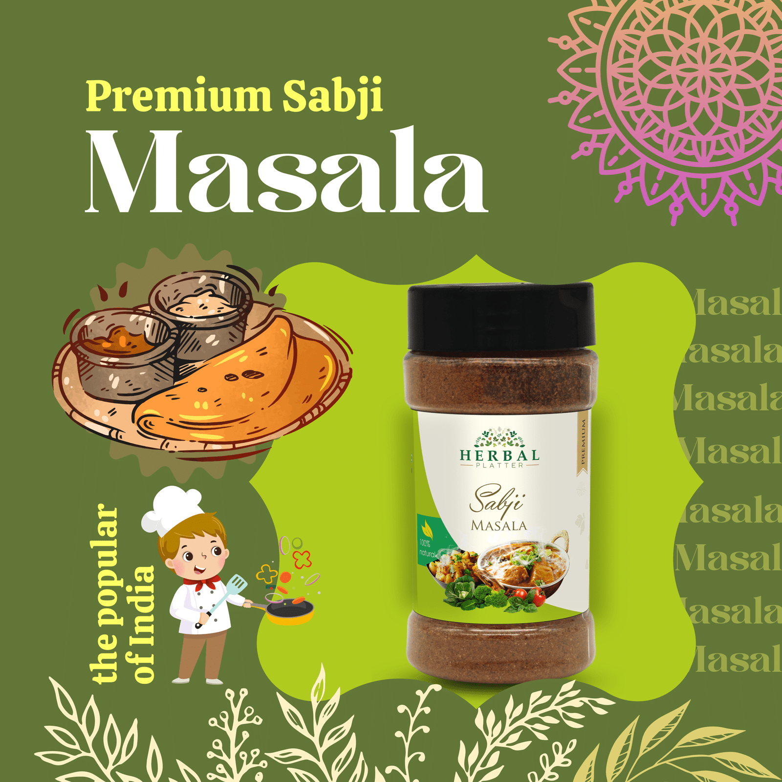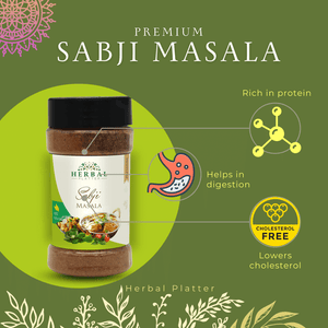 Herbal Platter's Sabji Masala is a perfect blend of aromatic herbs and spices, carefully crafted to elevate the flavors of your favorite vegetable dishes. Made with the utmost care and precision, our Sabji Masala promises to be your go-to seasoning for creating delectable, wholesome, and authentic Indian vegetable preparations.