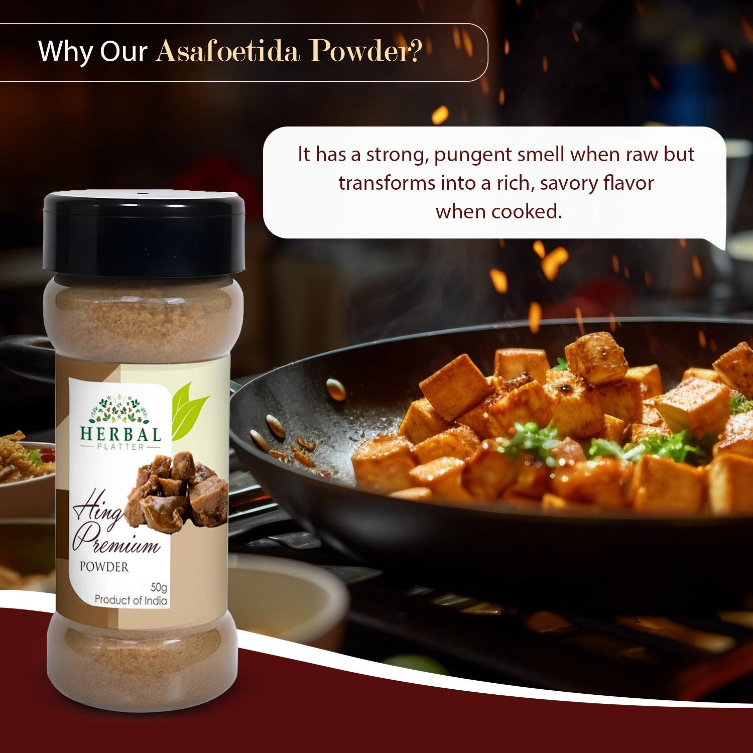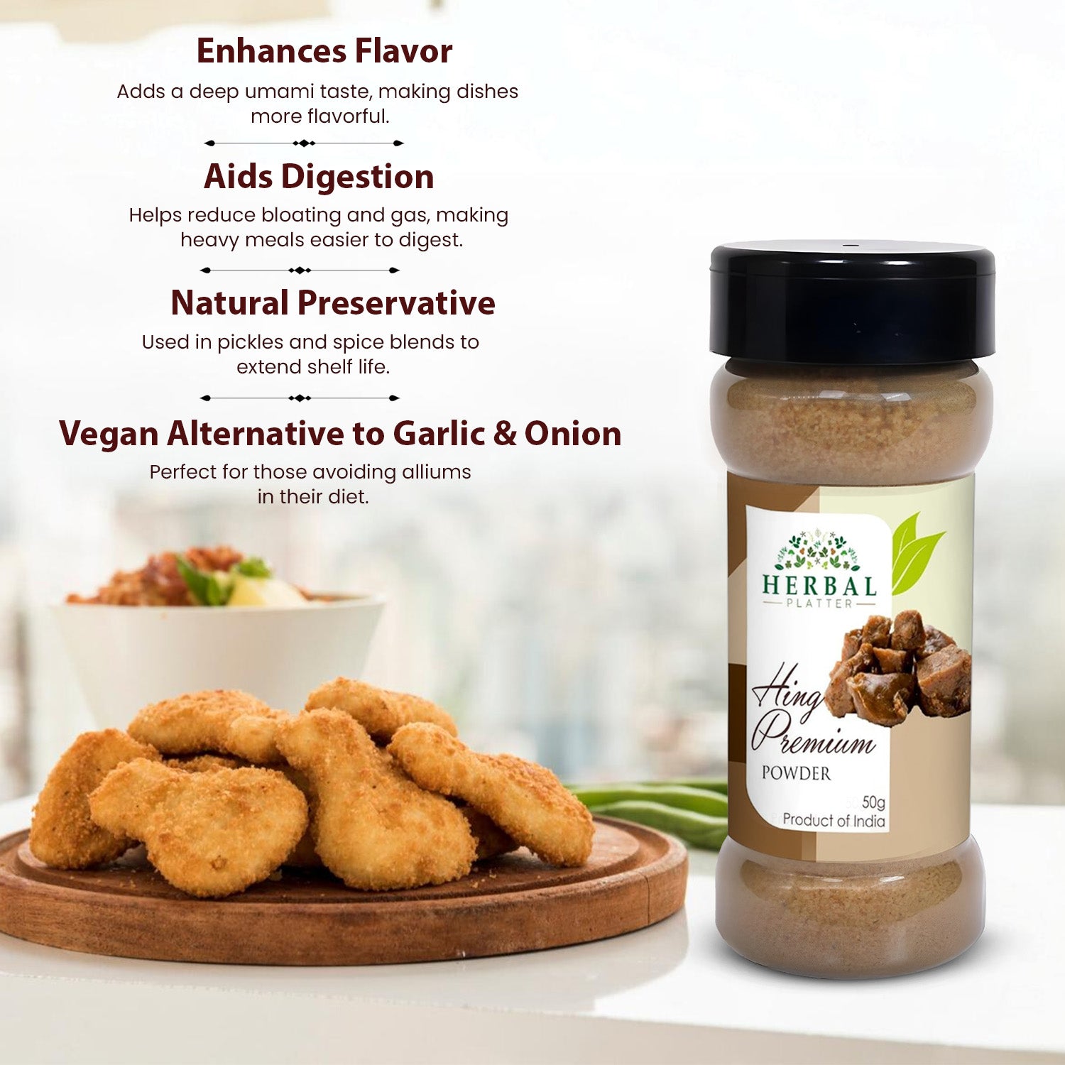 Introducing the most exquisite asafoetida powder you'll ever taste - Herbal Platter Bandhani Hing Premium! This high-quality ingredient will bring bold flavors and rich aromas to your recipes. Carefully crafted with the finest ingredients, this premium product meets the highest export standards, bringing the authentic taste of Indian cuisine to your kitchen. But what sets Herbal Platter Bandhani Hing Premium apart is its strong aroma. Just one whiff and your taste buds will tingle with excitement! And not only does this spice powder pack a punch of flavor, but it also offers numerous health benefits. It can stimulate digestive enzymes and aid in digestion, making it a natural choice for those with digestive issues. Plus, it's gluten-free, making it safe for those with gluten intolerance or allergies. Versatile and bursting with flavor, Herbal Platter Bandhani Hing Premium is a must-have for all your cooking adventures. So whether you're a master chef or just starting out, this premium spice.