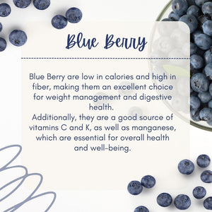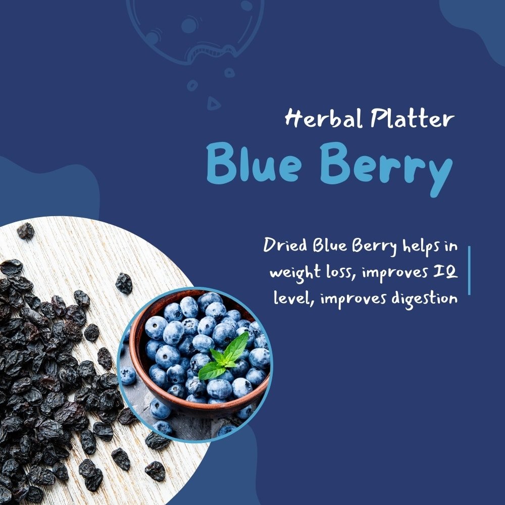 Herbal Platter Blue Berry is a nutrient-packed delight. These vibrant berries are rich in antioxidants, particularly anthocyanins, which shield your body from free radicals and contribute to overall well-being. With just 84 calories per cup, they offer a host of benefits: supporting heart health, enhancing memory, aiding exercise recovery. Incorporate these little blue gems into your diet for a delicious blend of taste and health! Herbal Platter's Blue Berry, a premium blend of handpicked, antioxidant-rich blueberries sourced from sustainable farms. Crafted with meticulous care and dedication, each batch encapsulates the purity of nature, delivering a burst of flavor and vitality with every bite. Versatile and nutritious, indulge in this culinary treasure as a snack or enhance your favorite dishes with its vibrant hue and irresistible taste. Trust in Herbal Platter's commitment to quality, sustainability, and authenticity, and elevate your culinary experience with the luscious goodness of Blue Berry.🌿🫐