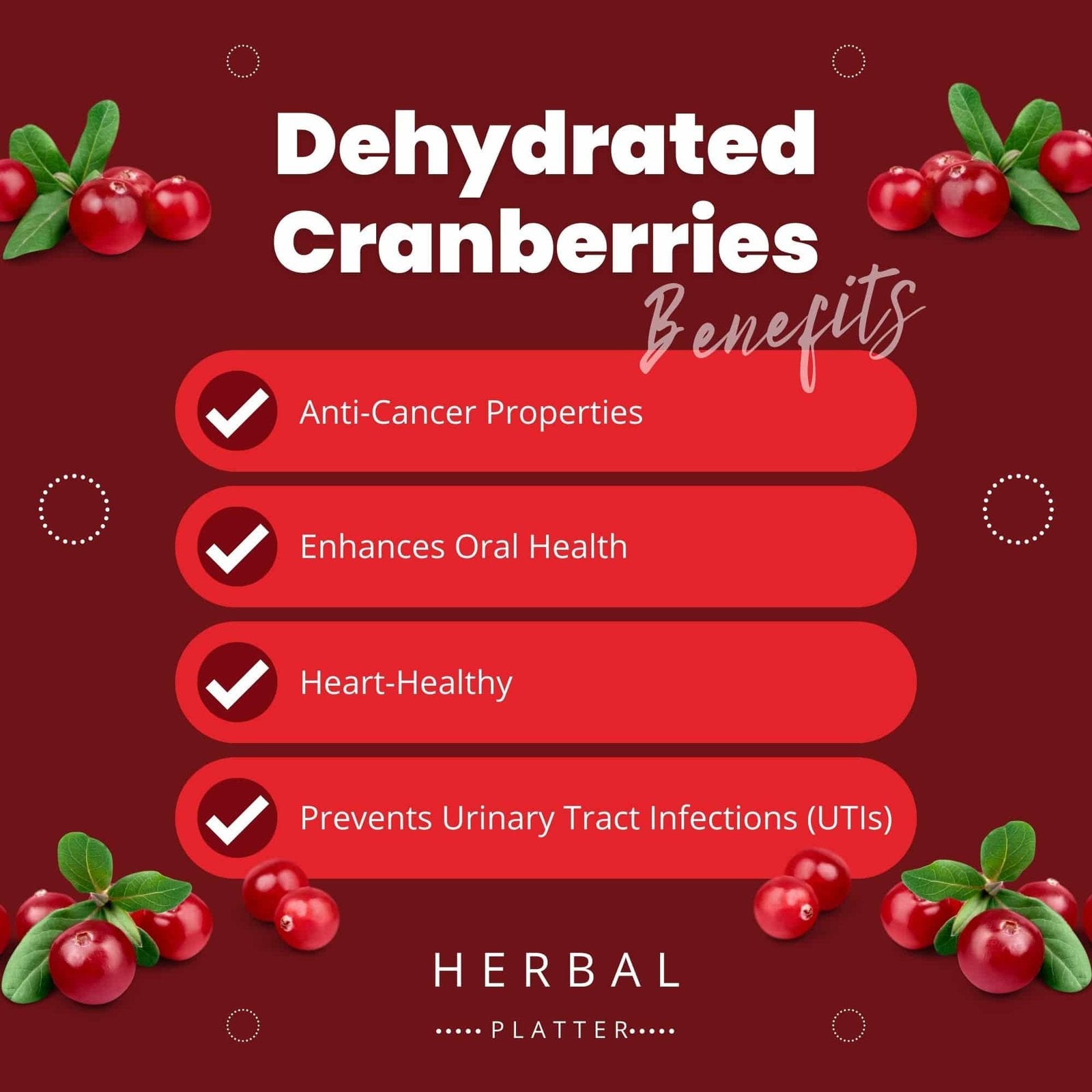Experience the deliciousness and nutritional benefits of Herbal Platter Dehydrated Cranberries today. Let their tangy, sugar-free delights become your go-to snack, providing a satisfying and flavorful experience. Elevate your snacking game with Herbal Platter Dehydrated Cranberries and embrace a healthier, tastier way of enjoying this beloved fruit.