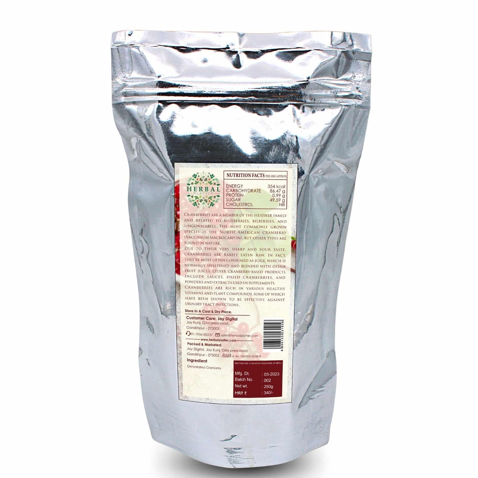 Packaged in a convenient stand-up pouch, Herbal Platter Dehydrated Cranberries have an extended shelf life, ensuring their freshness and flavor are preserved over time. Stock up on these delicious treats, and have them readily available whenever you need a wholesome and nourishing snack.