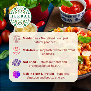 Introducing Herbal Platter Kodo Millet Pasta – a deliciously healthy twist on your favorite snack! Made with wholesome kodo flour, whole wheat flour, and a dash of rock salt, these pasta are the perfect alternative to junk food. Plus, each packet comes with a tasty, savory tastemaker that will make every bite a joy! A great choice for kids who deserve a healthier, yet scrumptious treat. Ready in minutes, they’re the perfect snack for fun-filled, guilt-free munching!