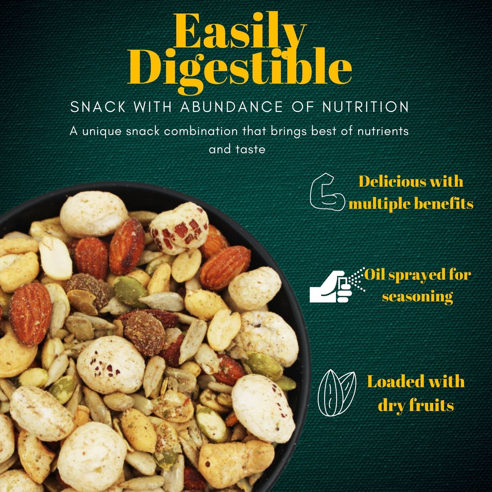 Our Trail Mix is carefully crafted using the finest ingredients to provide you with a snacking experience like no other. Each 200g pack is filled with a delightful combination of sunflower seeds, pumpkin seeds, cashew nuts, almonds, raisins, fox nuts, peanuts, fennel seeds, black salt, and cumin. These thoughtfully selected ingredients create a symphony of flavors and textures that will keep you coming back for more.