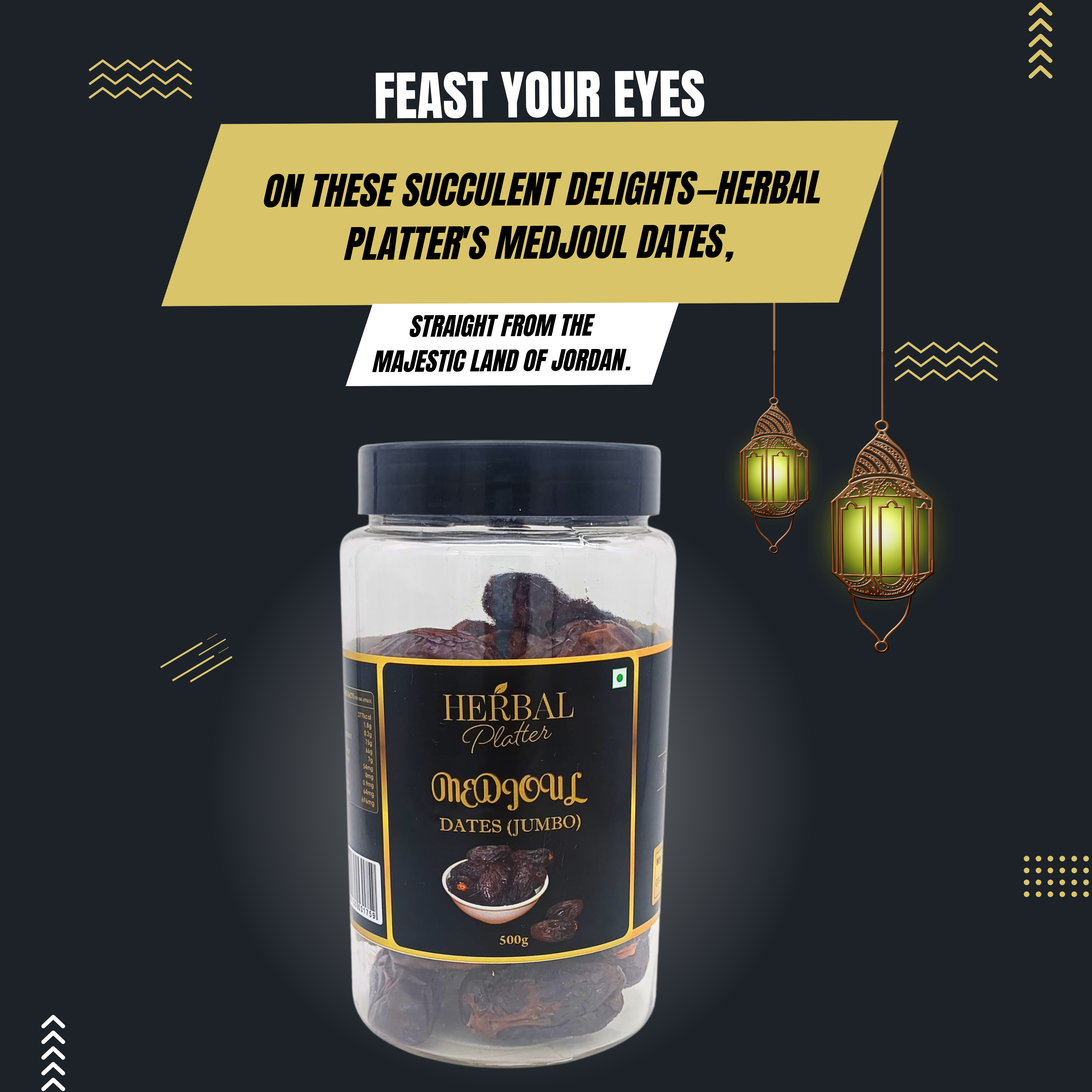 Each 500g pack of Herbal Platter Premium Medjoul Dates Jumbo Size is carefully packaged to ensure maximum freshness and quality. They are ideal for snacking, baking, or adding to your favorite smoothies, and make an excellent gift for health-conscious friends and family.