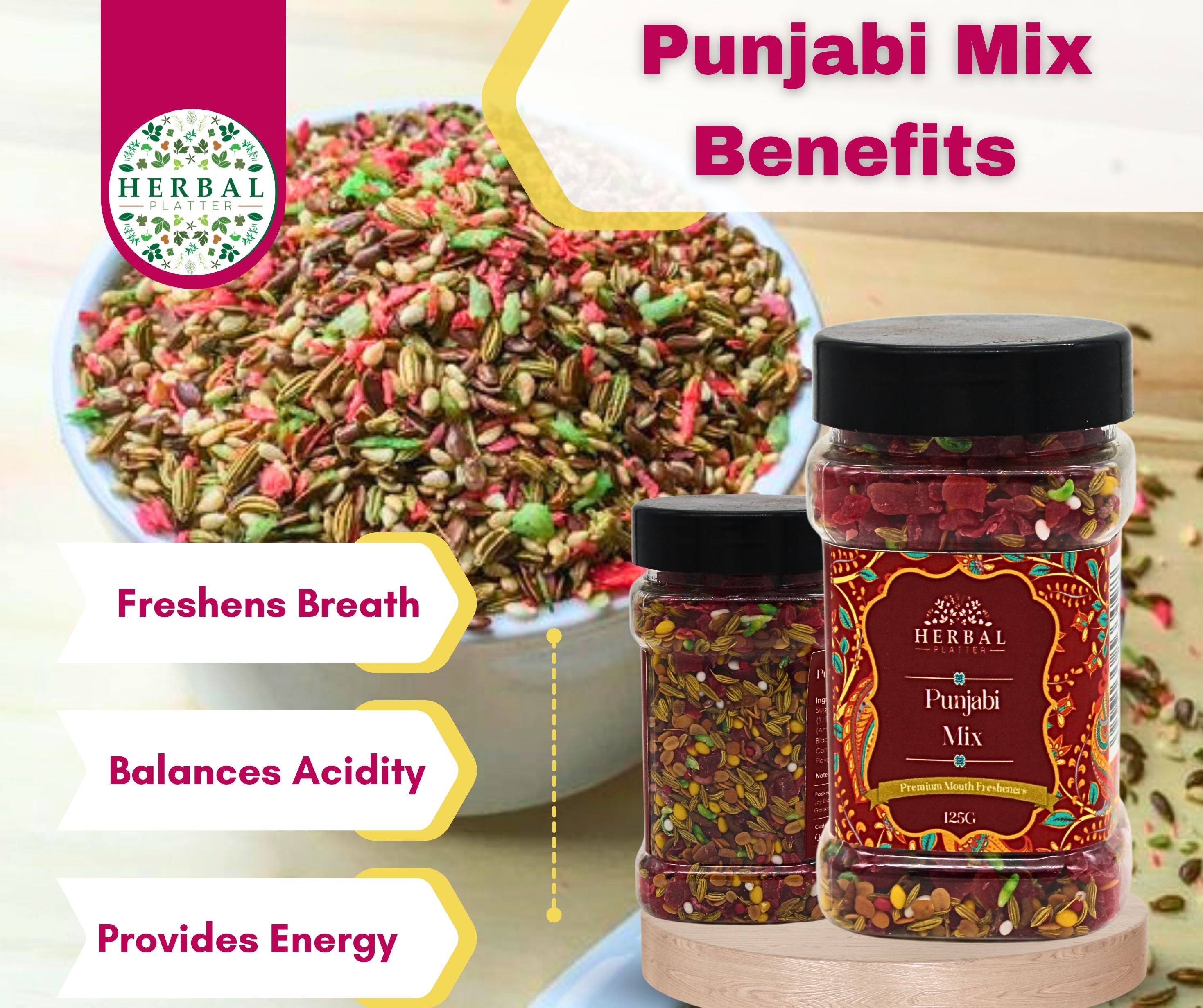 Punjabi Mix Mouth Freshener is a flavorful, aromatic blend of traditional ingredients commonly enjoyed in Punjab after meals. This mouth freshener combines a variety of natural spices, seeds, and dried fruits to offer a burst of sweetness and tanginess with every bite. The mix is designed to cleanse the palate, freshen the breath, and aid in digestion, making it the perfect post-meal treat.
