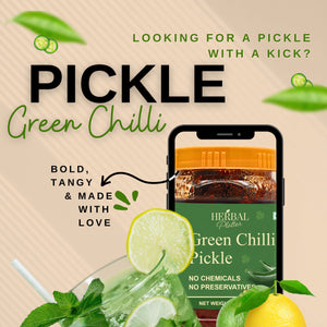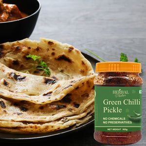 Elevate your dining experience with Herbal Platter Rajasthani Green Chilli Pickle. Embrace the bold and vibrant flavors of Rajasthan, made with love and without any added chemicals or preservatives. It's the perfect accompaniment that adds a tangy punch to your meals and takes your taste buds on a delightful journey. Taste the true essence of Rajasthan with every jar of Herbal Platter Rajasthani Green Chilli Pickle.