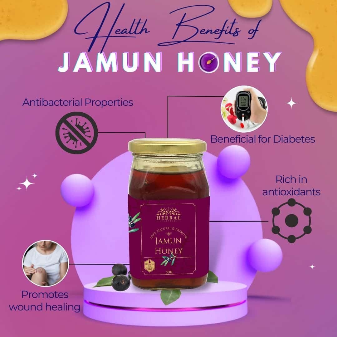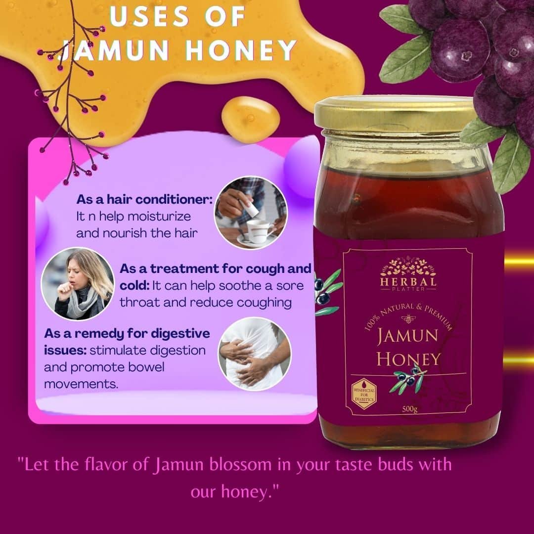 Herbal Platter Raw Unprocessed Jamun Honey not only tastes amazing but also improves digestion by aiding in reducing bloating and other digestive issues. Its regular consumption can also promote overall heart health by lowering cholesterol levels and improving blood circulation.
