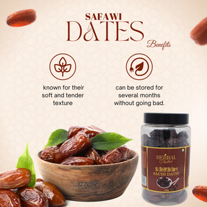 Each Safawi-Dates package from Herbal Platter is carefully curated to ensure maximum freshness and quality, maintaining the exceptional taste and nutritional value of these fruits. Whether enjoyed as a snack, added to your baking recipes, or blended into your favorite smoothies, Safawi Dates are a versatile and nutritious addition to your culinary repertoire.