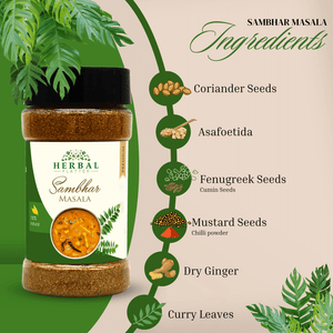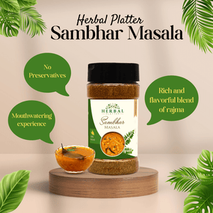 Welcome to the world of Herbal Platter, where we take pride in presenting our finest creation: "Sambhar Masala" - a delectable blend of traditional flavours with a herbal twist. Herbal Platter's Sambhar Masala is an extraordinary culinary companion, carefully crafted to elevate your everyday meals to a whole new level of gastronomic delight. Bursting with the goodness of handpicked herbs and aromatic spices, our Sambhar Masala promises to bring an authentic taste of South India right to your kitchen. Immerse yourself in the rich aroma and balanced flavours that our Sambhar Masala offers, making it an essential ingredient for creating the perfect sambhar, whether it's for idlis, dosas, rice, or any other dish you desire. Discover the fusion of tradition and innovation as you savour the goodness of Herbal Platter's Sambhar Masala, the secret to unlocking a world of soul-satisfying meals with every pinch. Treat your taste buds to an unforgettable journey - experience the essence of Herbal Platter's Sambhar Masala today!
