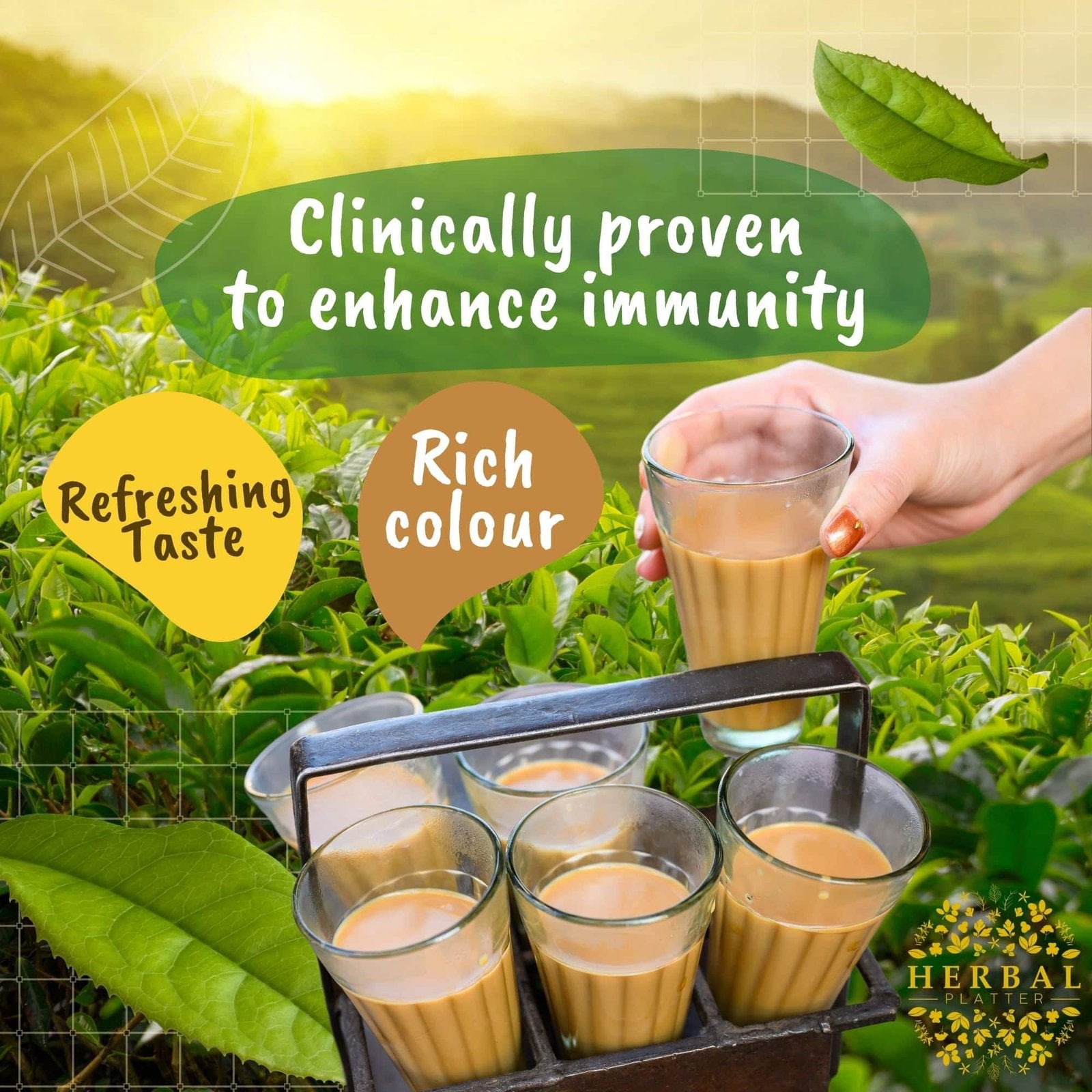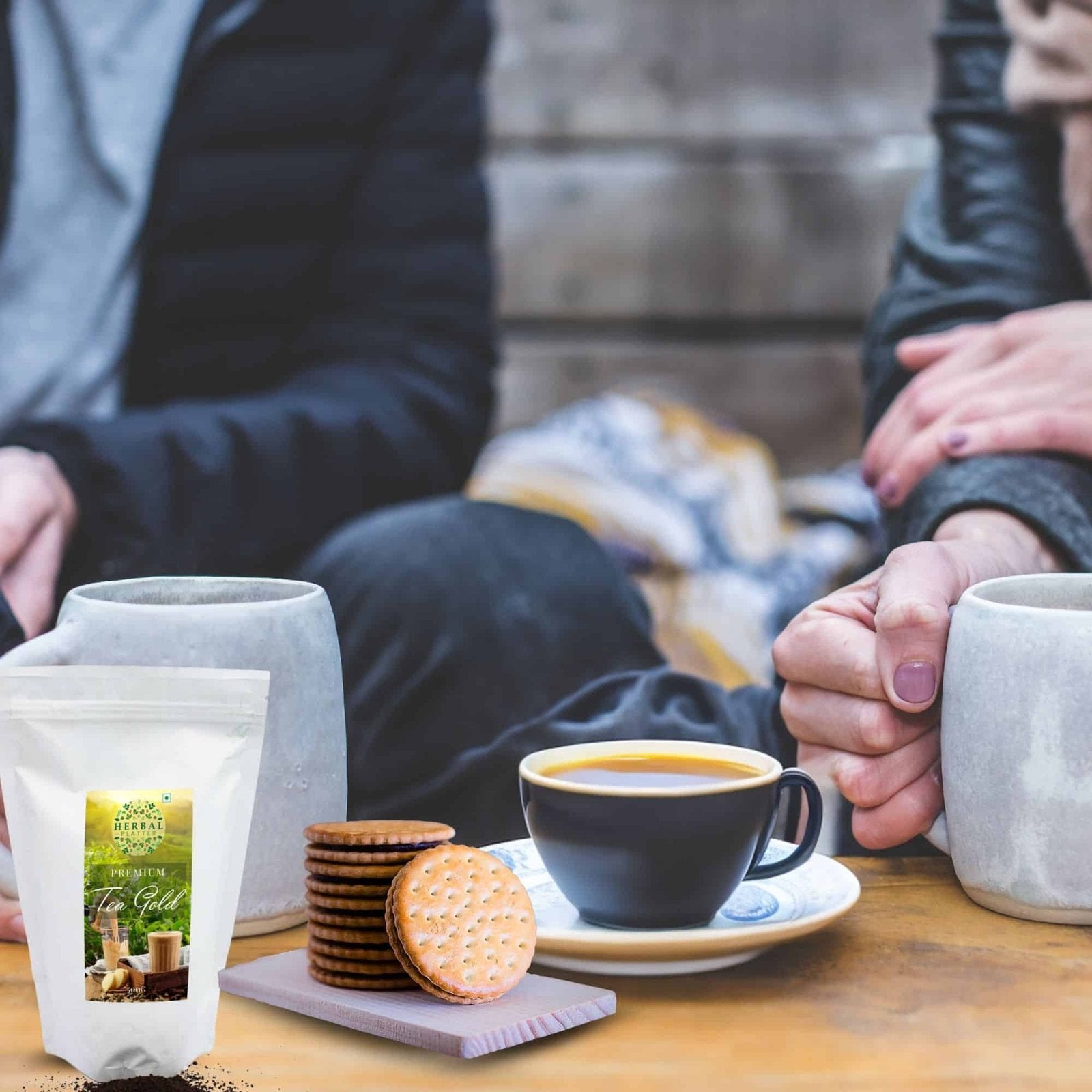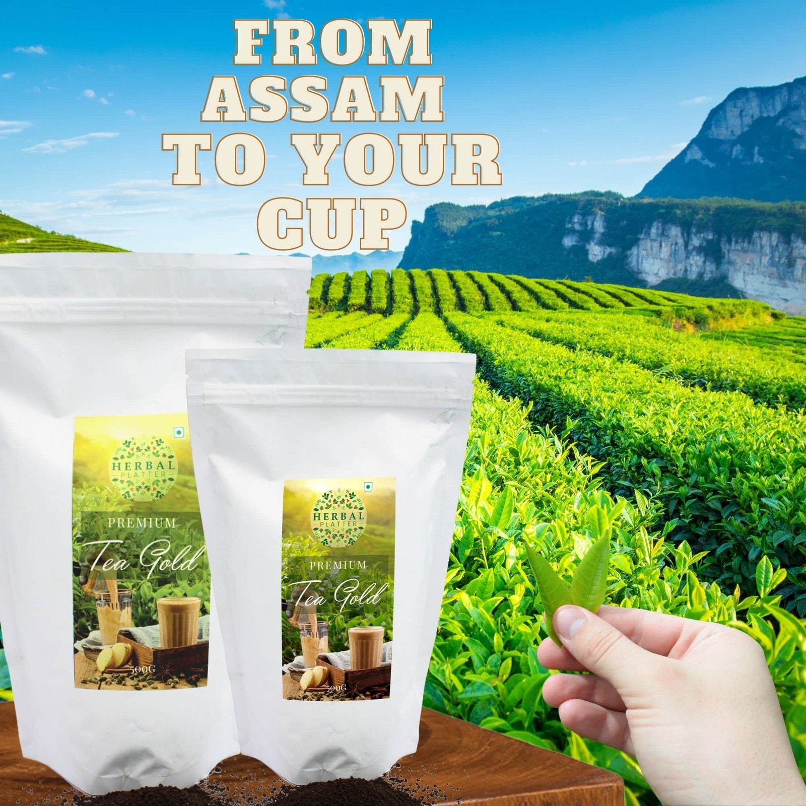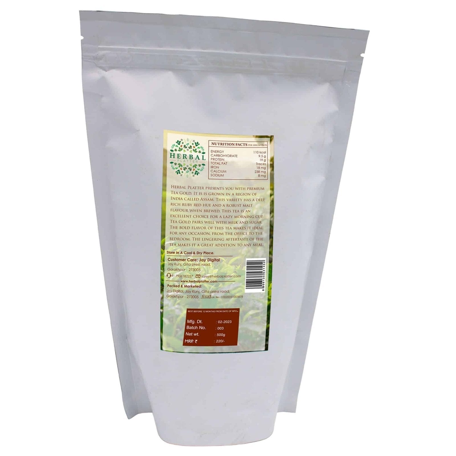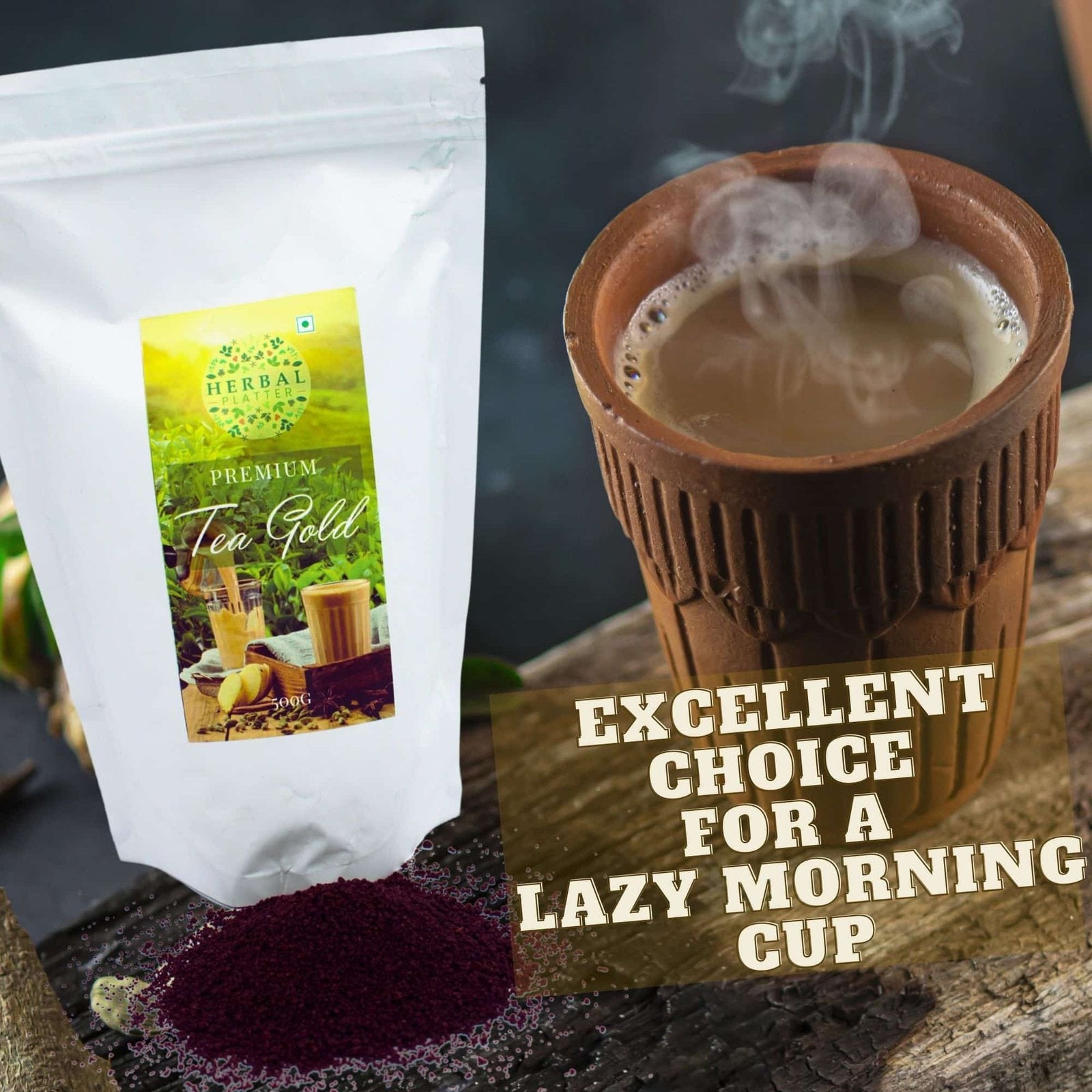 Looking for a tea that offers a rich and authentic flavour? Look no further than Herbal Platter Tea Gold – Premium Assam Chai Patti! This tea is made from premium quality Assam tea leaves, which are known for their robust flavor and full-bodied taste. When you brew a cup of Herbal Platter Tea Gold, you'll be treated to an authentic, full-bodied taste that tea lovers will appreciate. The aroma and taste of the tea awaken your senses, leaving you feeling refreshed and energized. You'll be able to taste the quality of the tea with every sip, as it's made from only the finest natural ingredients. One of the things that sets Herbal Platter Tea Gold apart from other teas on the market is its authenticity. The tea is made from 100% natural ingredients, ensuring a pure and authentic taste with no artificial additives. You can rest assured that you're drinking a tea that's good for you, and that's made from the highest quality ingredients. Not only is Herbal Platter Tea Gold delicious, it's also easy to prepare. Simply boil water, add the tea leaves, and simmer for a few minutes to enjoy a hot and delicious cup of tea. The tea is perfect for any time of day, whether you're looking for a morning pick-me-up or a relaxing evening drink. If you're looking for value for money, you'll love the 200g & 500g stand-up zipper pouches that Herbal Platter Tea Gold is available in. These pouches offer great value for money, making it easy to stock up on your favorite tea. You'll never run out of your favorite tea when you choose Herbal Platter Tea Gold. In conclusion, if you're looking for a tea that offers a rich and authentic flavor, you can't go wrong with Herbal Platter Tea Gold – Premium Assam Chai Patti. With its delicious taste, natural ingredients, and great value for money, it's the perfect choice for any tea lover. Try it today and experience the difference!